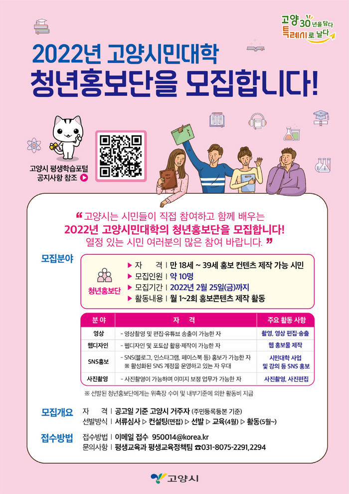 [부자동네타임즈 김인수기자] 고양시가 오는 2월 25일(금)까지 2022년 고양시민대학 청년홍보단을 모집한다.