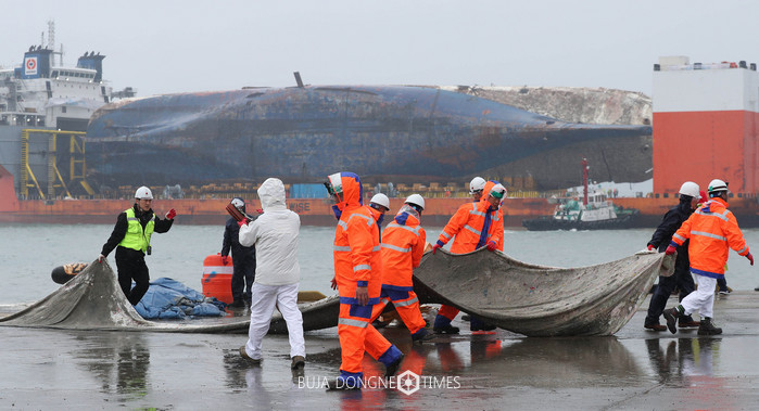 세월호 선체를 육상에 거치하는 작업이 초읽기에 들어간 5일 오전 전남 목포신항만에서 세월호가 모듈 트랜스포터를 이용한 육상거치를 위해 방향을 바꿔 재접안하고 있다. 2017.04.05.