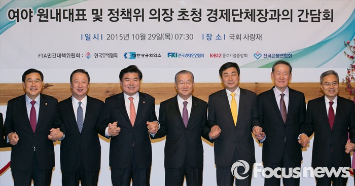 여야 원내지도부와 경제계 수장들은 29일 오전 국회에서 '여야 원내대표 및 정책위 의장 초청 경제단체장과의 간담회'를 열고 한·중 FTA 비준과 경제활성화를 위한 주요 법안들의 처리에 관해 의논했다.
