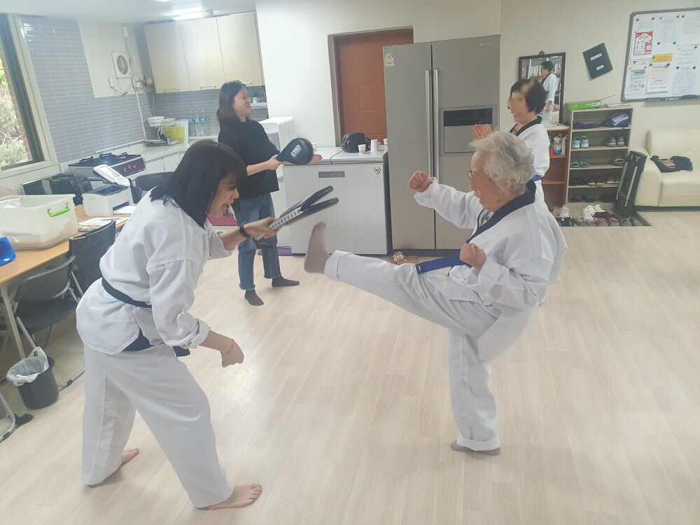[사진설명] 은빛 태권도 프로그램 중 발차기를 하고 있다.