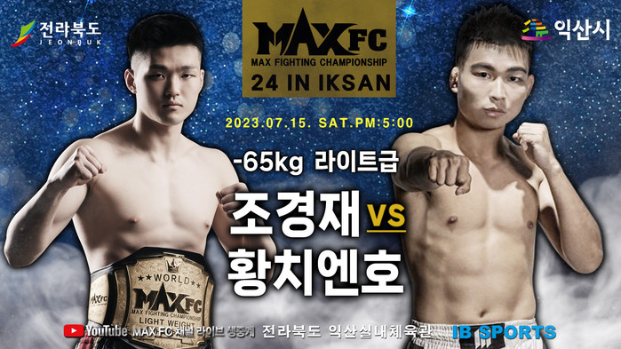 [부자동네타임즈 김인수기자] 국내 최대 입식격투기 단체 MAXFC(대표 이용복)가 오는 7월 15일(토) 익산실내체육관에서 열리는 ‘MAX FC 24 IN 익산’ 대회의 한국, 대만 양국 챔피언간의 한대전 경기 발표와 함께 대회의 모든 대진을 확정 발표했다. 대한민국 입식격투기 경량급 최강자 MAXFC 라이트급 챔피언 조경재(25,인천정우관)와 대만 산타 웰터급 챔피언 황치엔호(黃謙和/26,대만 IRON GYM)의 경기가 이날의 메인 경기로 결정되었다.