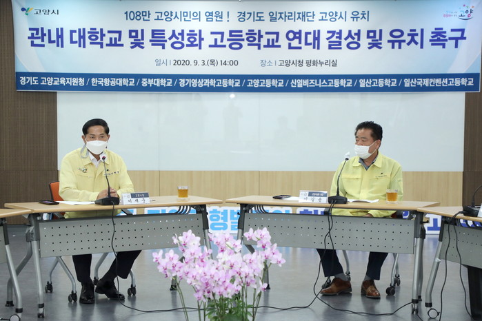 이날 촉구결의발표 행사는 코로나19 확산방지를 위해 참석인원을 최소화하고 간략히 진행했다. 이재준 고양시장, 이길용 고양시의회 의장, 최승천 경기도 고양교육지원장을 비롯해 관내 중부대·한국항공대학교 총장, 고양고·경기영상과학고·신일비즈니스고·일산고·일산국제컨벤션고 등 5개 특성화 고등학교 교장 등 10명이 참석해 함께 유치 촉구문을 발표했다.