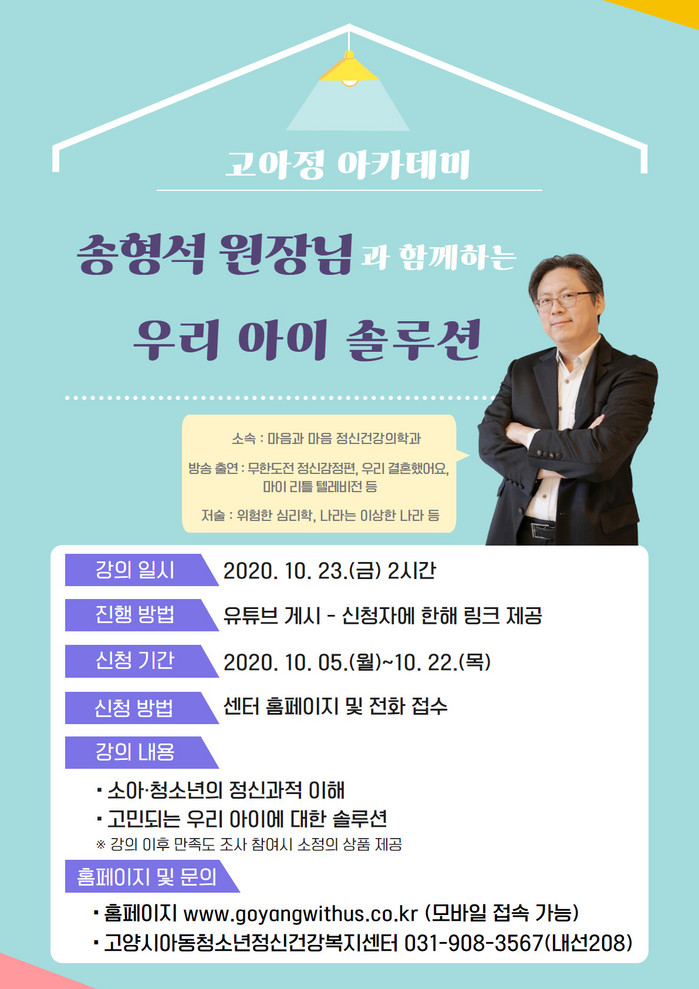 [부자동네타임즈 김인수기자] 고양시는 아동·청소년정신건강복지센터는 코로나 블루 극복을 위해 ‘송형석원장님과 함께하는 우리 아이 솔루션 온라인 강의’를 오는 23일(금) 개최한다.
