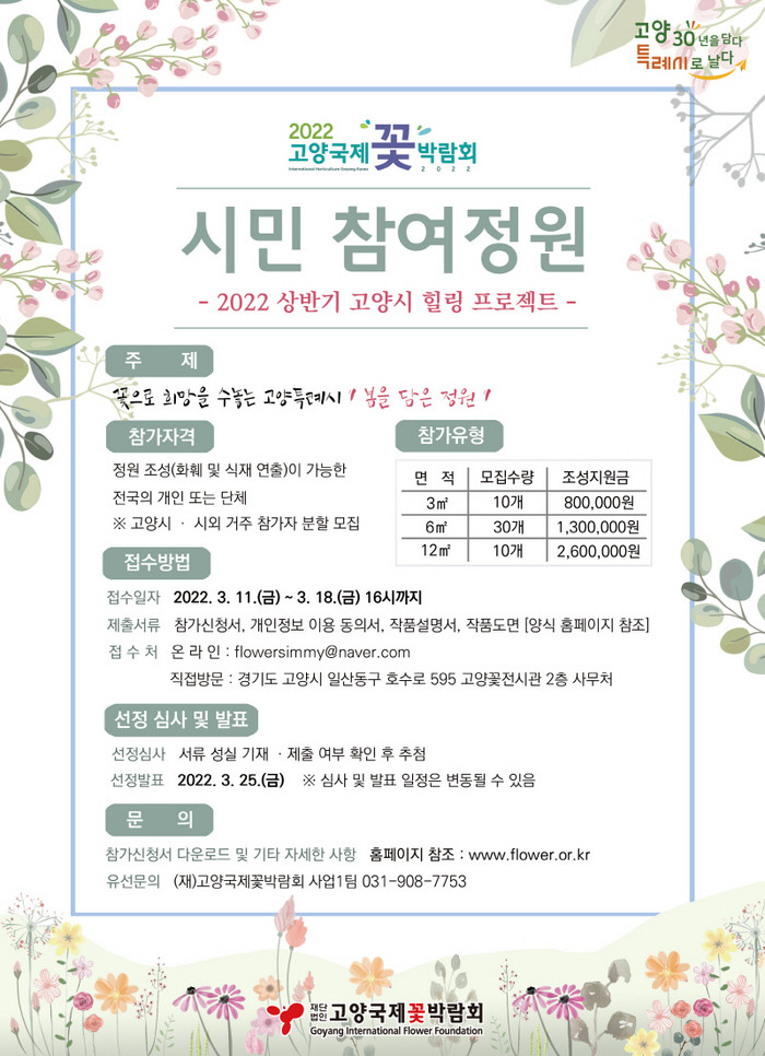 [부자동네타임즈 김인수기자] 재단법인 고양국제꽃박람회(대표이사 박동길)는 고양시민이 직접 참여하고 꾸미는 정원 문화 확산 사업 2022 상반기 시민 참여정원 참가자를 오는 3월 11일부터 18일까지 8일간 모집한다고 밝혔다.