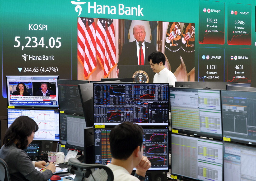 일 서울 중구 하나은행 본점 딜링룸에 도널드 트럼프 미국 대통령의 대국민 연설 뉴스와 코스피가 나오고 있다. 이날 트럼프 대통령이 이란을 상대로 강경 발언을 내놓으면서 원/달러 환율이 20원 가까이 반등했다. 코스피는 244.65포인트(4.47%) 하락한 5,234.05 거래를 마쳤으며, 코스닥도 59.84포인트(5.36%) 떨어진 1,056.34로 마감했다. 2026.4.2