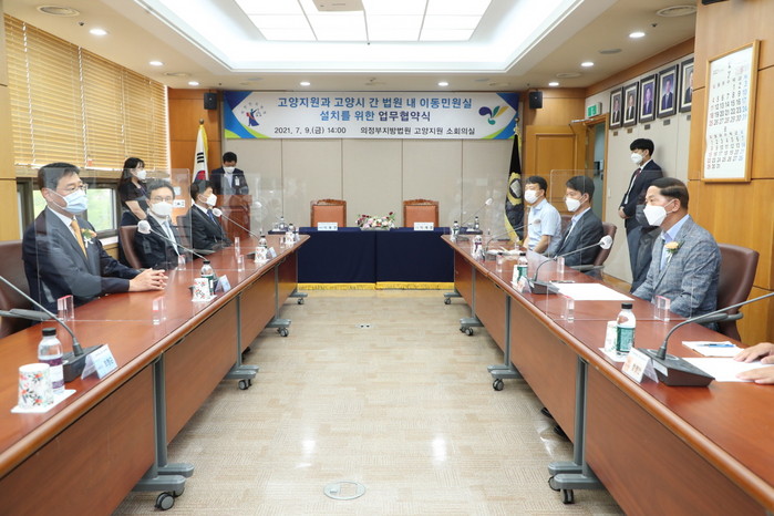 의정부지방법원 고양지원에서 지난 7월 9일 열린 협약식에서 이재준 고양시장과 이동연 고양지원장은 의정부지방법원 고양지원 청사 1층에 설치한 이동민원실 운영에 관한 고양시와 고양지원의 세부 협력사항을 주요 내용으로 하는 협약서를 교환했다.