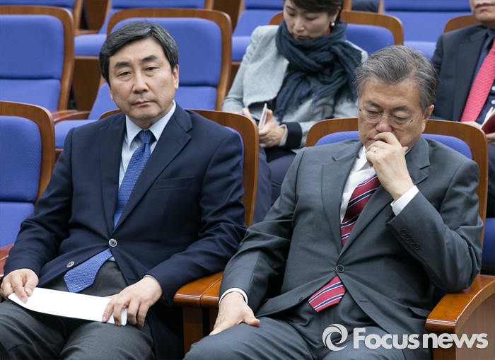 | △ 문재인(오른쪽) 새정치민주연합 대표와 이종걸 원내대표가 6일 오후 서울 여의도 국회에서 의사일정 등 국회 정상화 논의를 위해 열린 의원총회에 참석해 생각에 잠겨 있다. <사진제공=포커스뉴스> |