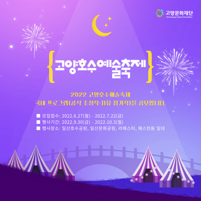 [부자동네타임즈 김인수기자] 고양시가 주최하고 고양문화재단(대표 정재왈)이 주관하는 호수, 거리, 자연, 사람이 어우러진 도심의 축제, 2022 고양호수예술축제에 참여할 거리 예술가를 오는 7월 22일까지 공개 모집한다. 2009년부터 시작된 고양호수예술축제는 해마다 가을 시즌에 고양시 일산 호수공원과 인근 거리에서 펼쳐지는 대표적인 글로벌 거리예술축제다.