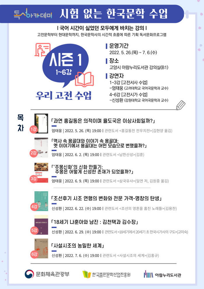 시즌 1인 1~6강에서는 도서관 독서문화프로그램에서 상대적으로 덜 다뤄진 우리 고전 서사와 시가를 대중의 눈높이에서 흥미롭게 소개한다.