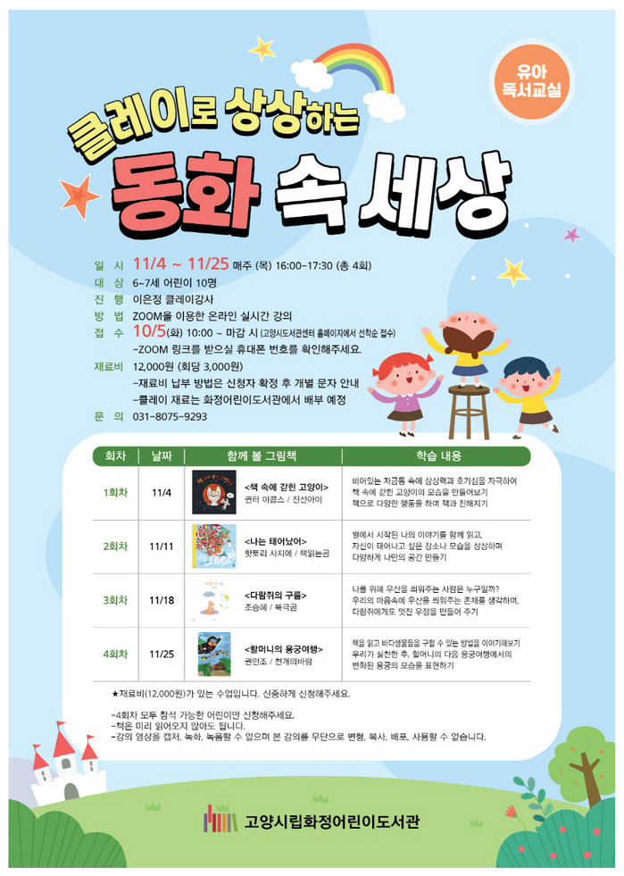 접수는 10월 5일(화) 오전 10시부터 고양시도서관센터 홈페이지에서 선착순으로 모집한다. 기타 자세한 사항은 화정어린이도서관으로 문의하면 된다.