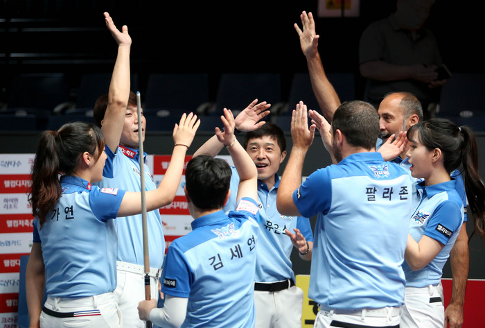이밖에 이날 열린 다른 경기서는 SK렌터카가 ‘일본 여자 3쿠션 전설’ 히다 오리에의 2승을 앞세워 하나카드를 세트스코어 4:2로 누르고 공동 3위(3승2패·승점9)에 올랐다. 크라운해태와 NH농협카드는 각각 웰컴저축은행, 에스와이를 세트스코어 4:3으로 꺾었다. NH농협카드는 최근 2연패를 벗어나며 5위(3승2패·승점8)에 올랐고, 크라운해태는 3연승으로 공동 3위(3승2패·승점9)에 이름을 올렸다.