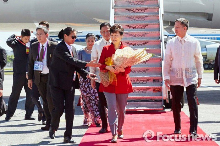 △ 박근혜 대통령이 18일 오전(현지시간) 캐나다, 필리핀 정상과의 양자회담으로 공식 일정을 시작했다. 사진은 17일 필리핀 마닐라에 도착한 박 대통령. <사진출처=청와대>