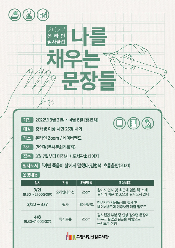 [부자동네타임즈 김인수기자] 고양시 신원도서관이 오는 21일(월)부터 4월 8일(금)까지 15일간 2022 온라인 필사클럽 ‘나를 채우는 문장들’을 운영한다.