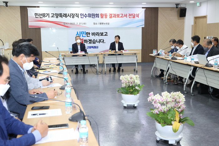 고양특례시장직 인수위원회는 6월 14일부터 7월 20일까지 약 36일간 업무보고, 현장방문, 전체회의, 분과별 회의 등을 거치며 민선8기의 시정 방향과 공약의 정책과제 방안을 마련하기 위해 노력해 왔다. 인수위원회는 15명 위원으로 4개 분과(기획조정, 경제1, 경제2, 사회문화)를 구성하고 5개 특별위원회(교통혁신, 도시정비, 시정개혁, 일자리, 교육혁신)를 두고 활동해 왔다. 인수위원회의 전반적 활동내용과 정책과제 내용은 오는 8월19일까지 백서(白書)로 제작, 발간할 예정이다.