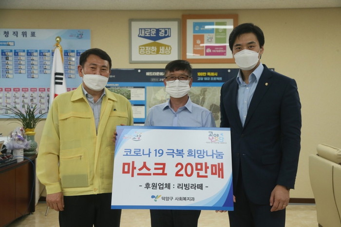 [부자동네타임즈 김인수기자] 고양시 덕양구(구청장 명재성)는 지난 9일 관내 업체인 리빙라떼(대표 이동표)에서 취약계층을 위한 마스크 200,000매를 기탁했다고 밝혔다.
