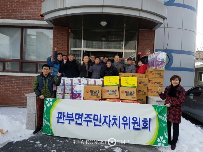 [부자동네타임즈 김민석기자]판부면 주민자치위원회(위원장 김근태)와 백운산한우리회(회장 김진노)는 지난 26일(목) 오전 11시 판부면사무소에서 독거노인 등 26명을 대상으로 설맞이 불우이웃돕기 후원물품 전달식을 가졌다.