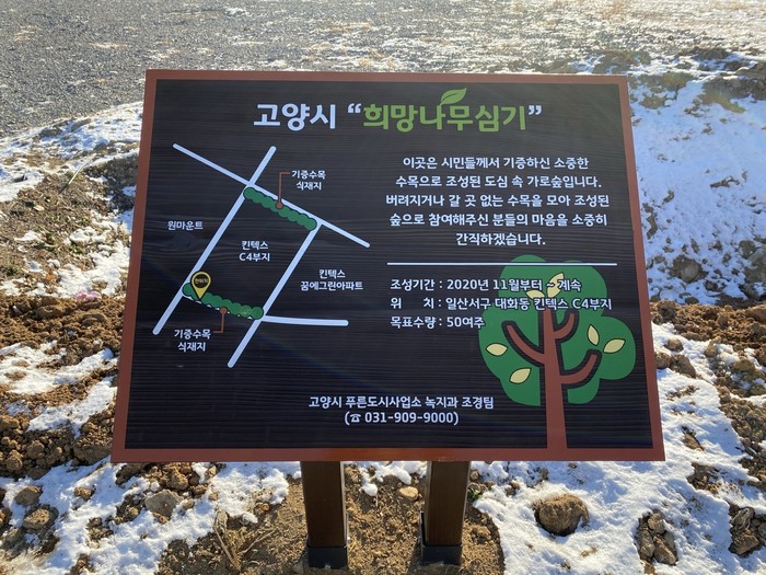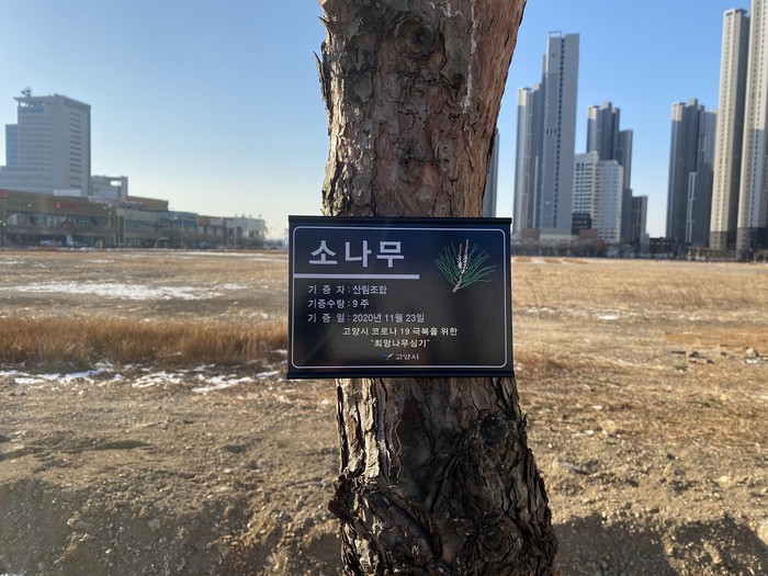 시는 고양시 산림조합으로부터 소나무 25주를 기증받아 9주는 킨텍스 C4부지(남, 북측)에, 16주는 현재 조성 중인 탄현근린공원에 이식하고 기증자, 수종 및 수량 등이 적힌 명패를 달아 참여한 시민들의 소중한 마음을 남겼다.