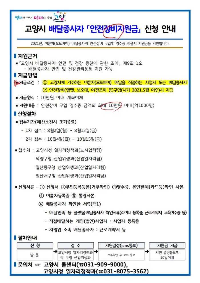 [부자동네타임즈 김인수기자] 고양시가 전국 최초로 배달종사자 안전장비 지원 사업을 실시한다. 대상은 관내 배달종사자 1천여 명이며, 배달종사자가 안전장비를 구입한 후 신청서류와 영수증을 제시하면 구입금액에 대해 최대 10만원까지 현금으로 지원한다.