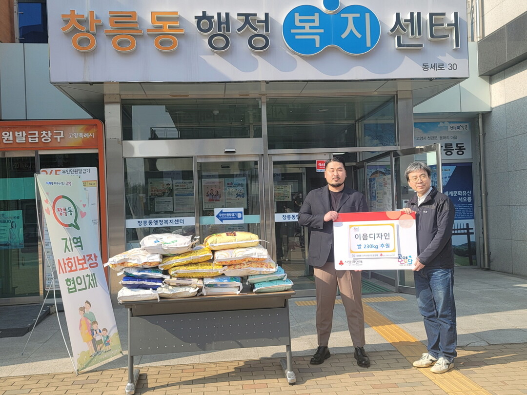 올해 1월 개업한 이음디자인은 주변의 어려운 이웃들에게 따뜻한 나눔을 실천하기 위해 개업 축하 화환 대신 쌀을 받아 창릉동 행정복지센터에 기부했다. 정성을 담아 기부한 쌀 230kg은 창릉동 관내 기초생활수급자, 한부모 등 저소득 가정에 전달될 예정이다.
