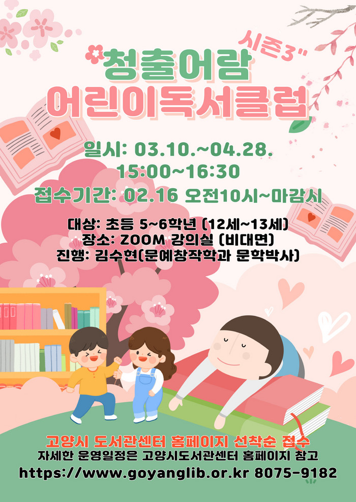 [부자동네타임즈 김인수기자] 고양시 식사도서관이 초등학교 5~6학년 12명을 대상으로 소수정예 어린이 독서클럽 청출어람 독서클럽 시즌3을 오는 3월 10일부터 운영한다.