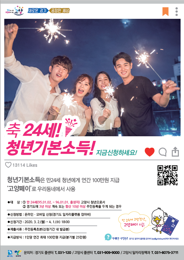 또한 재산, 소득, 취업여부에 관계없이 1인당 분기별 25만원씩 최대 연 100만원을 고양시 지역화폐(고양페이)로 지급 받는다.