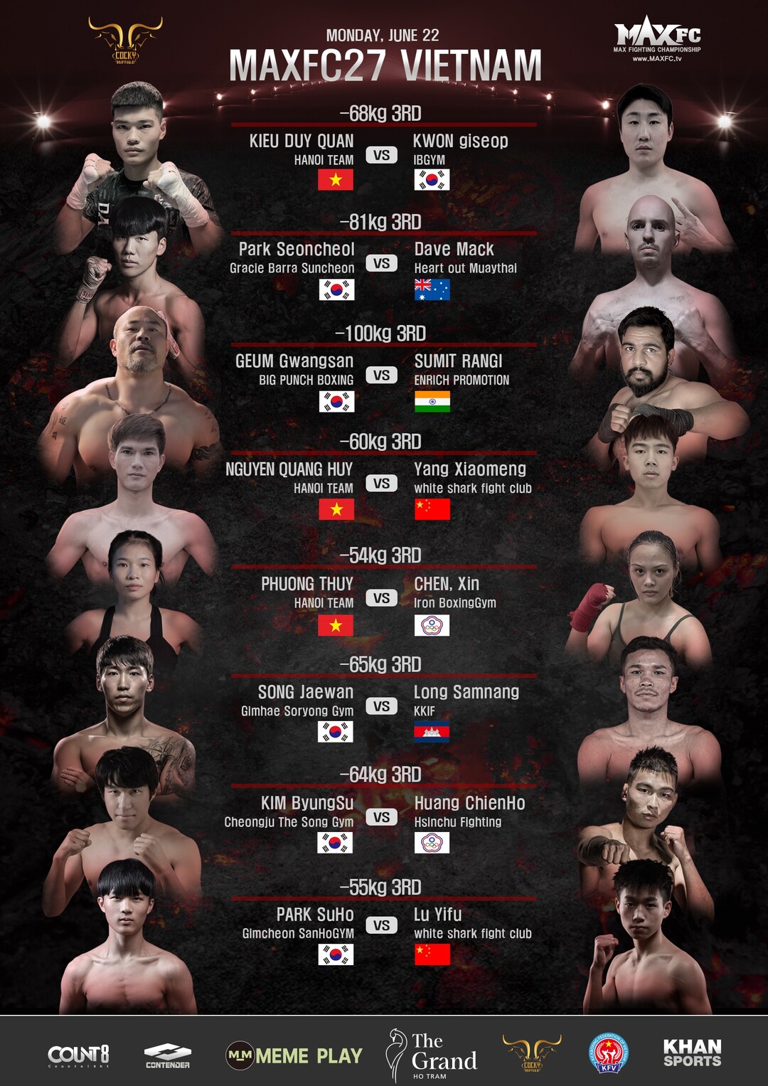 이번 ‘MAXFC 27 IN 베트남’은 베트남 붕따우 더그랜드호트램 특설링에서 진행되며, 유튜브 채널 MAXFC에서 생중계된다.