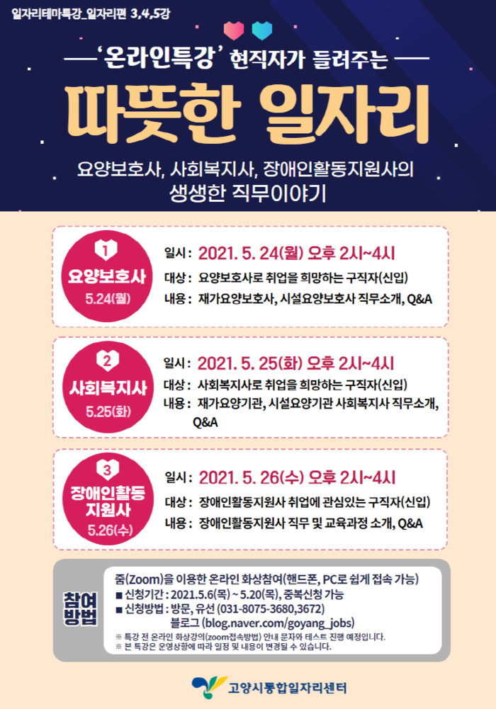 [부자동네타임즈 김인수기자] 고양시 통합일자리센터에서는 오는 24일부터 3일간 온라인 특강 ‘현직자가 들려주는 따뜻한 일자리’를 운영한다.