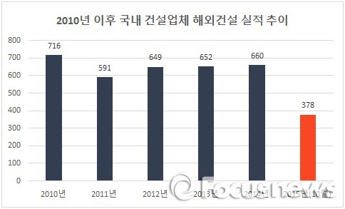 지난 5년간 국내 업체들의 해외건설 수주실적은 ▲2010년 716억달러 ▲2011년 591억달러 ▲2012년 649억달러 ▲2013년 652억달러 ▲2014년 660억달러를 기록했다.