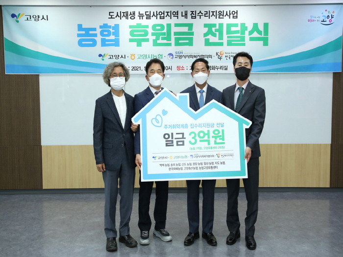 [부자동네타임즈 김인수기자] 고양시는 지난 13일 ‘도시재생 뉴딜사업지역 내 집수리지원사업’ 추진을 위한 농협 후원금 전달식을 고양시청 평화누리실에서 개최했다.