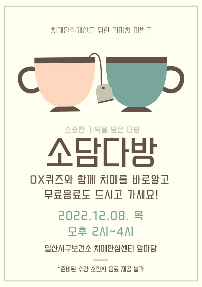 [부자동네타임즈 김인수기자] 고양특례시(시장 이동환) 일산서구 보건소 치매안심센터는 치매인식개선을 위한 ‘소담다방(소중한 기억을 담은 다방) 캠페인’을 12월 8일 14시부터 16시까지 일산서구 치매안심센터 앞마당에서 진행한다.