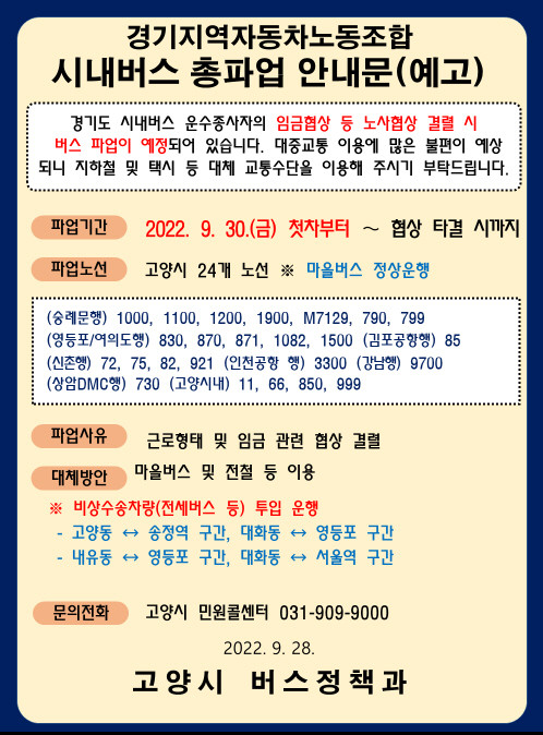 한편, 고양시는 제1부시장을 본부장으로 하는 비상수송대책본부를 24시간 비상근무 체계를 유지해 운행 중단 현황을 지속해서 파악하는 한편, 버스 운행 중단을 알리는 안내문을 버스정류장 등에 게시하고, 시 홈페이지와 SNS 등에 운행중단 노선과 대체노선을 안내할 계획이다.