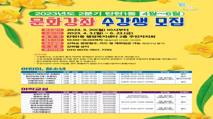 [부자동네타임즈 김인수기자] 고양특례시 탄현1동 주민자치회는 2023년 2분기(4~6월) 주민자치센터 문화강좌 신규 수강생을 모집할 계획이다. 3월 20일부터 동 행정복지 센터 2층 주민자치회실에서 수강 접수를 받으며 4월 3일부터 프로그램 운영을 시작한다