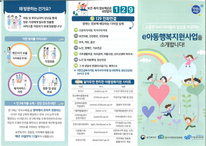 ‘e아동행복지원사업’은 18세미만의 아동을 양육하는 가정에 방문을 통해 아동 및 부모의 복지욕구와 양육환경을 확인하고 적절한 복지서비스를 지원하는 맞춤형 복지서비스 제공 사업이다.