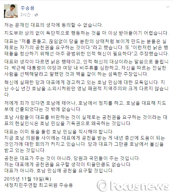△ 주승용 새정치민주연합 최고위원 페이스북 게시글. <사진출처=주승용 최고위원 페이스북>