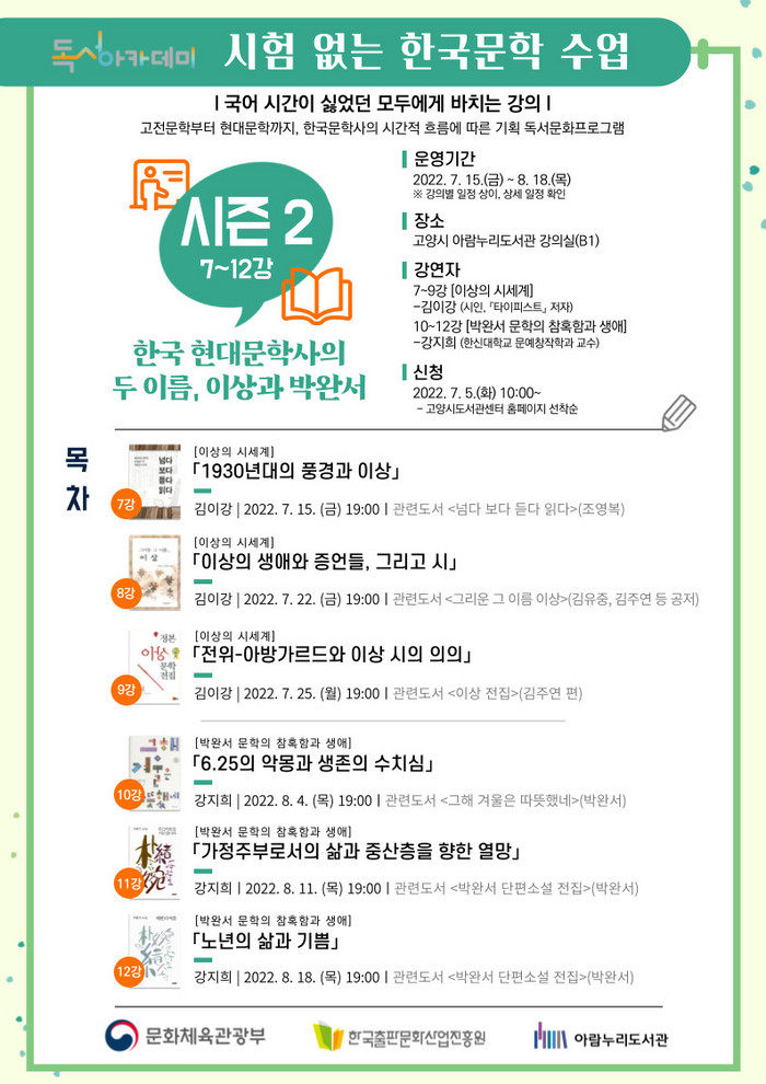 [부자동네타임즈 김인수기자] 고양시(이동환 시장) 아람누리도서관이 오는 7월 15일부터 시험 없는 한국문학 수업 시즌2 ‘한국 현대문학사의 두 이름, 이상과 박완서’를 운영한다.