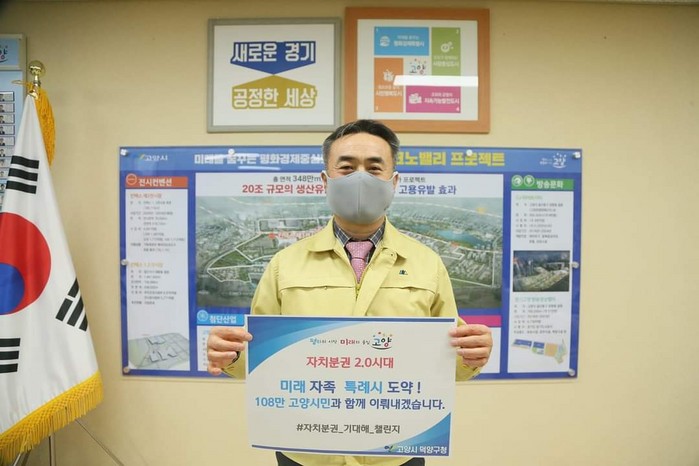 이날 김 구청장은 이길용 고양시의회 의장과 김훈래 자치분권협의회 부의장의 지목으로 챌린지에 참여해, ‘미래 자족 특례시 고양, 108만 고양시민과 함께 이뤄내겠습니다’라는 메시지를 전하며 진정한 주민 주권 실현을 앞둔 기대감을 드러냈다.