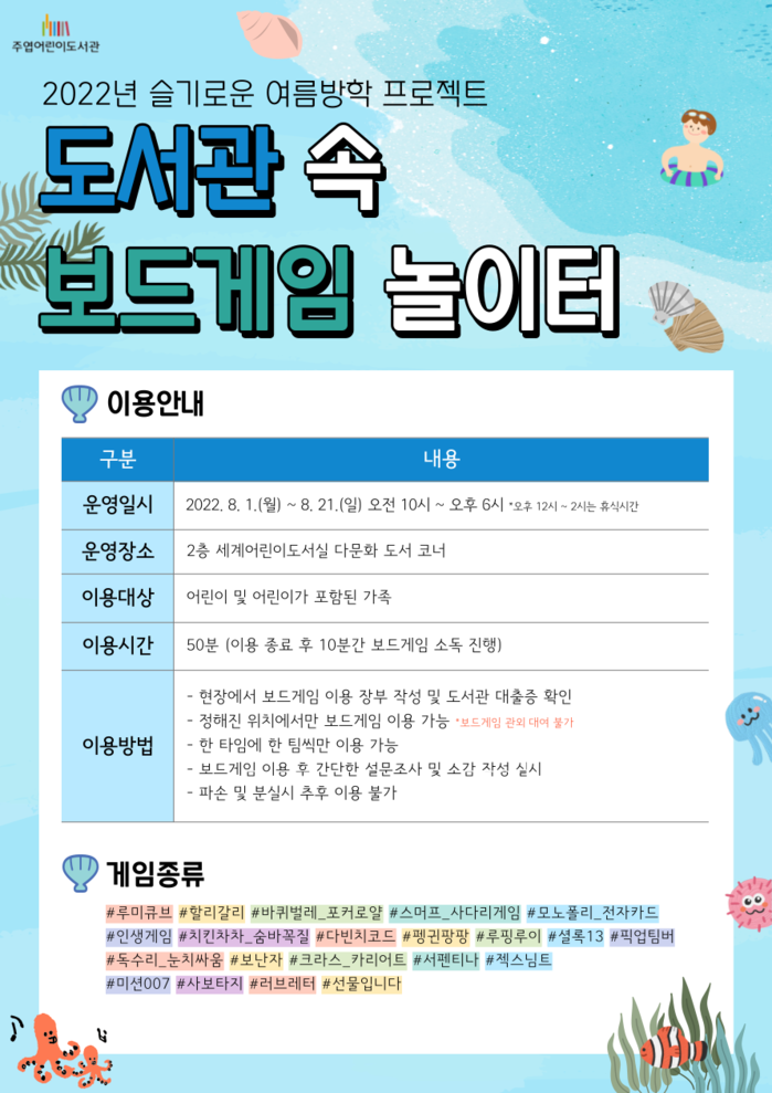 지난해부터 주엽어린이도서관은 코로나19 장기화로 어린이의 실외 활동이 제한된 상황을 고려하여 방학 시기마다 보드게임 대여 서비스를 실시했다. 올해 여름방학 보드게임 대여 서비스는 도서관에서 원하는 보드 게임을 바로 즐기는 현장 참여 방식으로 운영될 예정이다.