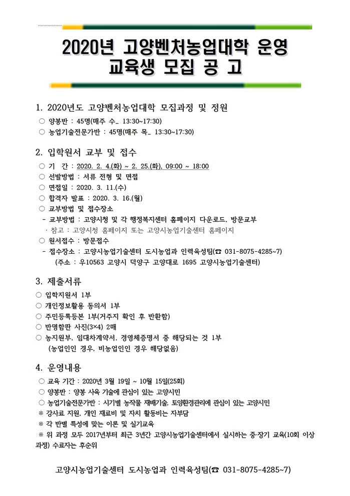 미래농업 이끌어갈 2020년도 고양벤처농업대학 교육생 모집.