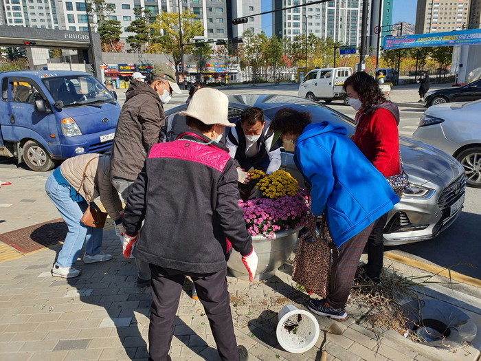 [부자동네타임즈 김인수기자] 고양시 덕양구 효자동행정복지센터(동장 양재관)은 10월 27일, 효자동 직능단체(주민자치회, 통장협의회)를 중심으로 지축역 앞 인도, 효자동 5통 일영로 행정게시판 및 효자동행정복지센터 앞 화단에 국화 120본을 식재했다.