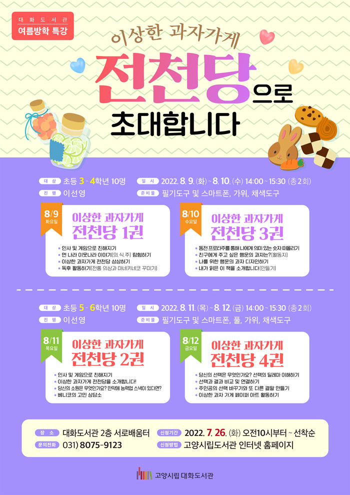 [부자동네타임즈 김인수기자] 고양특례시(시장 이동환) 대화도서관이 여름방학을 맞아 8월 9일부터 12일까지 어린이를 위한 프로그램 이상한 과자가게 전천당으로 초대합니다를 운영한다.