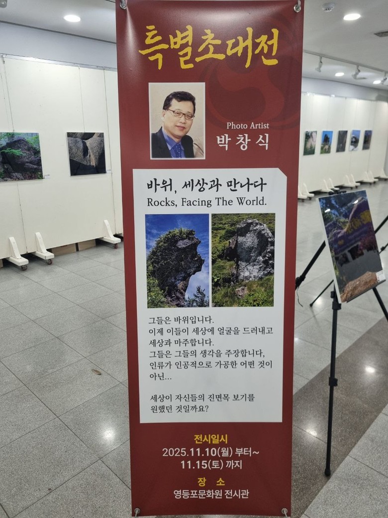 박창식 사진작가가 자신의 작품 세계를 담은 특별초대전 '바위, 세상과 만나다(Rocks, Facing The World)'를 개최하고 있다. 이번 전시는 2025년 11월 10일 월요일부터 11월 15일 토요일까지 6일간 영등포문화원 전시관에서 진행된다.