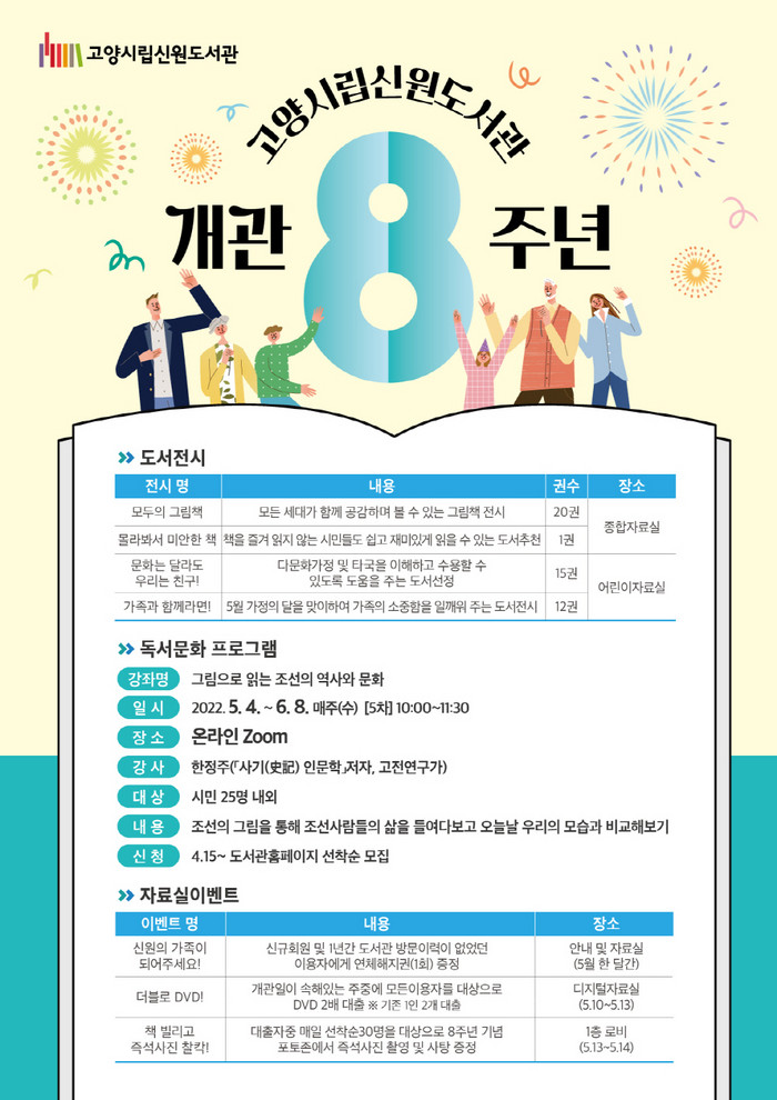 [부자동네타임즈 김인수기자] 고양시 신원도서관에서 오는 5월 13일 개관 8주년을 맞아 지역 주민과 함께 기념행사를 진행한다. 저자 초청 인문학 프로그램, 자료실 이벤트, 북큐레이션 등 다양한 온.오프라인 행사가 진행될 예정이다.