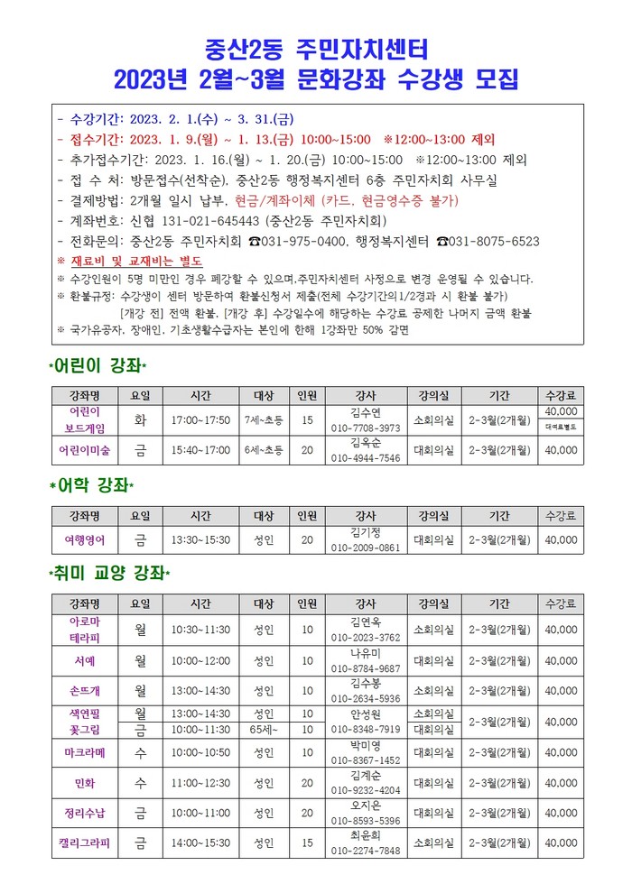 [부자동네타임즈 김인수기자] 고양특례시 일산동구 중산2동 주민자치회는 2023년 1월 9일부터 ‘2023년 2월~3월 주민자치센터 문화강좌 수강생을 모집’한다.