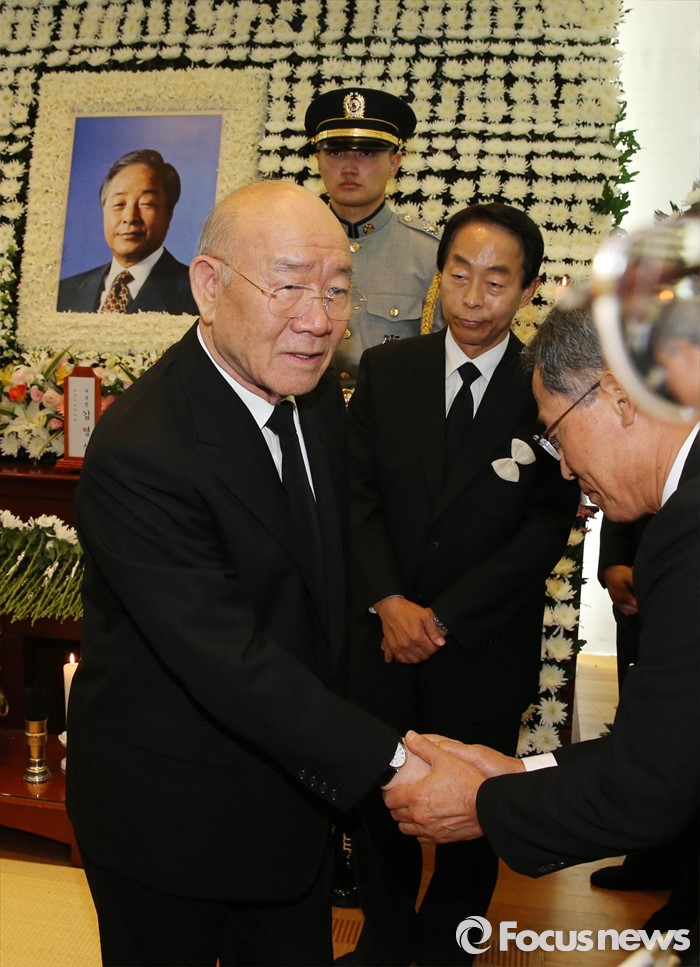 (서울=포커스뉴스) 전두환 전 대통령이 25일 고 김영삼 전 대통령의 빈소가 마련된 서울 종로구 서울대병원 장례식장을 찾아 조문한 뒤 상주들과 인사를 나누고 있다. 가운데는 김 전 대통령의 차남인 현철씨.