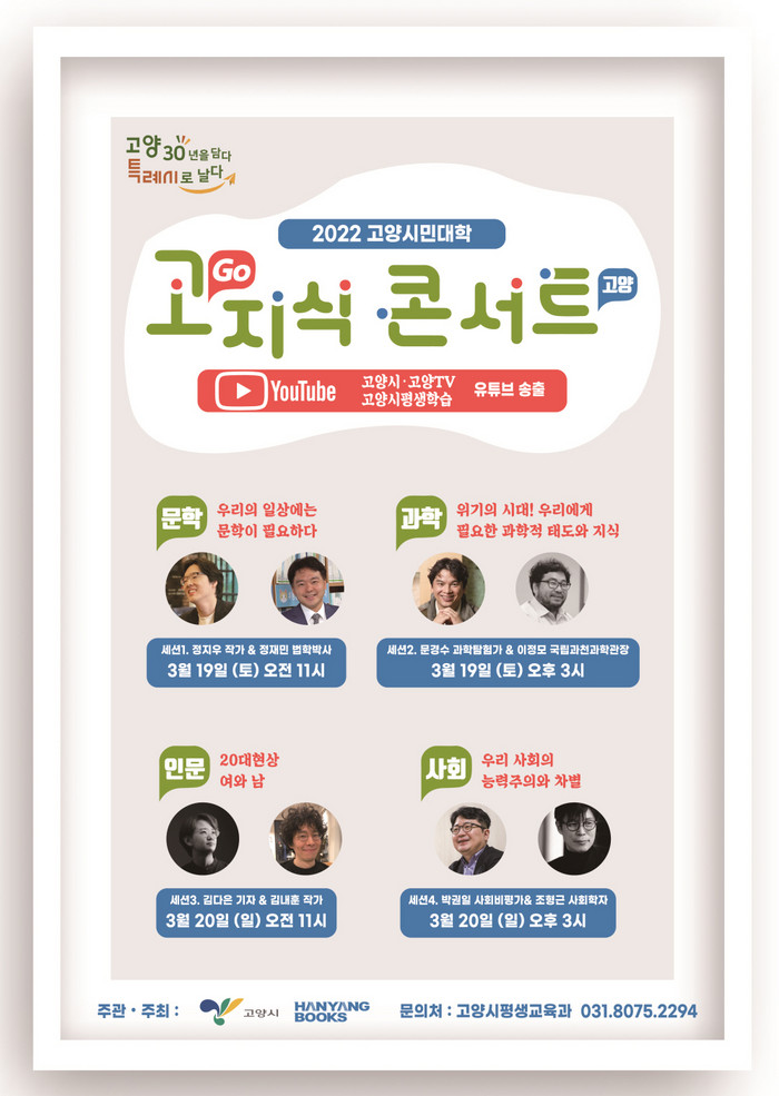 [부자동네타임즈 김인수기자] 고양시는 오는 3월 19일(토)~20일(일) 양일간 2022년 고양시민대학의 오프닝 프로그램으로 ‘고지식콘서트’를 개최한다.