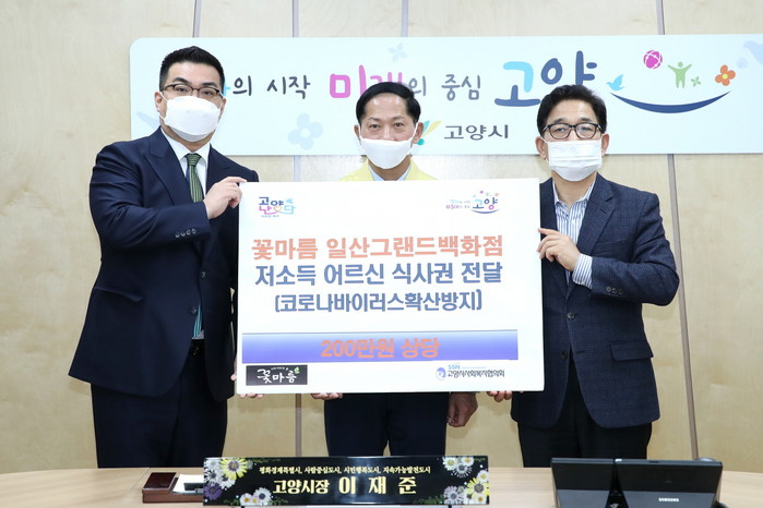 이날 꽃마름 일산그랜드백화점은 신종 코로나바이러스 사태로 무료급식소 운영이 중단돼 끼니 해결이 어려운 독거노인 등 사회 취약계층을 위해 200만원 상당의 식사권을 기탁했다.