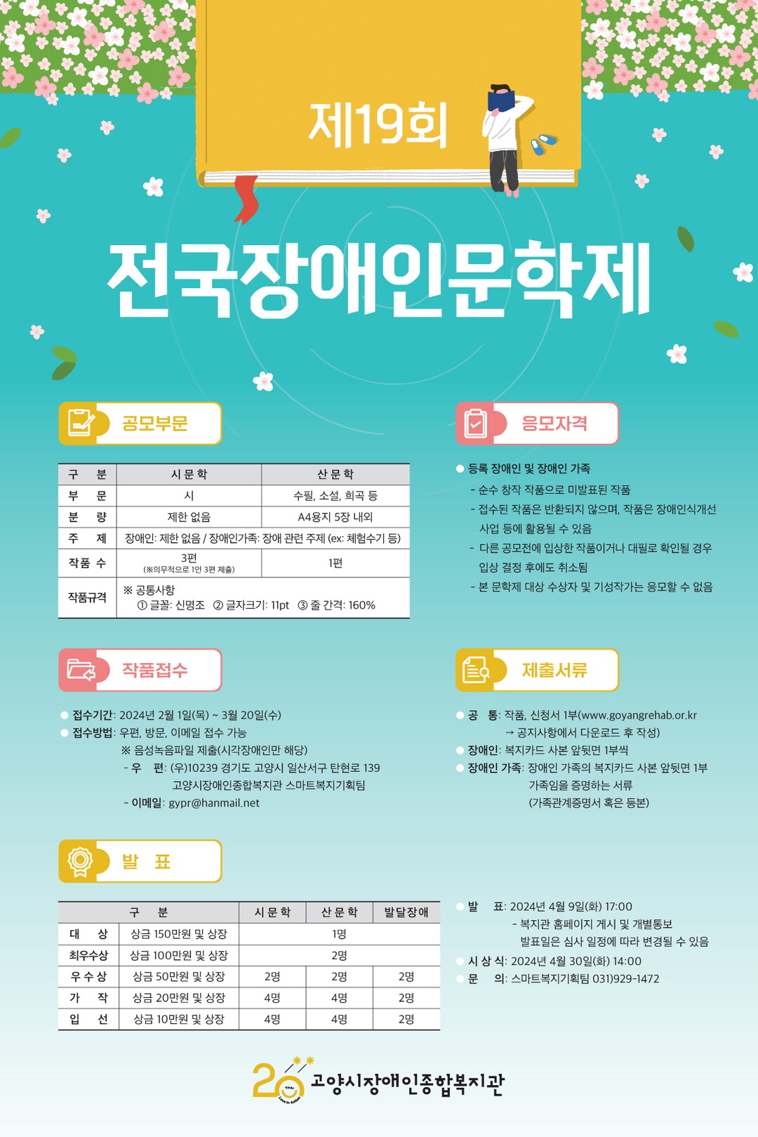 [부자동네타임즈 = 김인수 기자] 고양시장애인종합복지관(관장 신혜용)에서 2024년 제19회 전국장애인문학제를 개최하고 3월 20일까지 출품작 접수를 받는다.