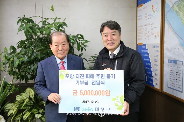 마포구는 지난 11. 15. 경북 포항 지역에 발생한 지진으로 인해 다수의 이재민이 발생함에 따라 이재민을 돕기 위한 성금(의연금)을 지난 12월 11일부터 14일까지 모금했다.