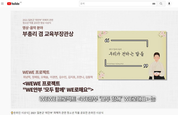 ‘WEWE 프로젝트’팀이 이번 공모전에서 수상하게 된 작품은 ‘WE안부, 모두 함께, WE로해요’ 온라인 전시회 영상물(첨부 사진 QR코드 스캔)로, 일본군 ‘위안부’ 피해 역사를 지역사회에 상기시켜 우리가 함께 기억해야 하는 역사임을 알리고 일본군 ‘위안부’ 피해 할머니께 보내는 메시지를 모아 롤링페이퍼 책자로 만들어 전하는, 그 내용에 담긴 정성과 노력을 인정받아 수상하게 되었다.