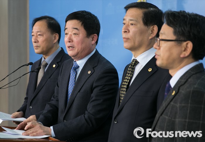 (서울=포커스뉴스) 14일 오전 서울 여의도 국회 정론관에서 김주성(왼쪽부터) 경기도의회 교육위원장, 강득구 경기도의회 의장, 박래학 서울시의회 의장, 김문수 서울시의회 교육위원장이 누리과정 예산반영 촉구 기자회견을 히고 있다.